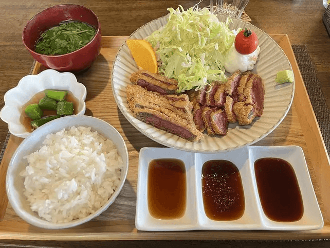 牛カツは3種類のこだわりのつけだれで頂きます。中には三ヶ日(みっかび)みかんを使用した「三ヶ日みかんソース」という浜松らしいものもあり、最後まで飽きずに食べられると人気ですよ。