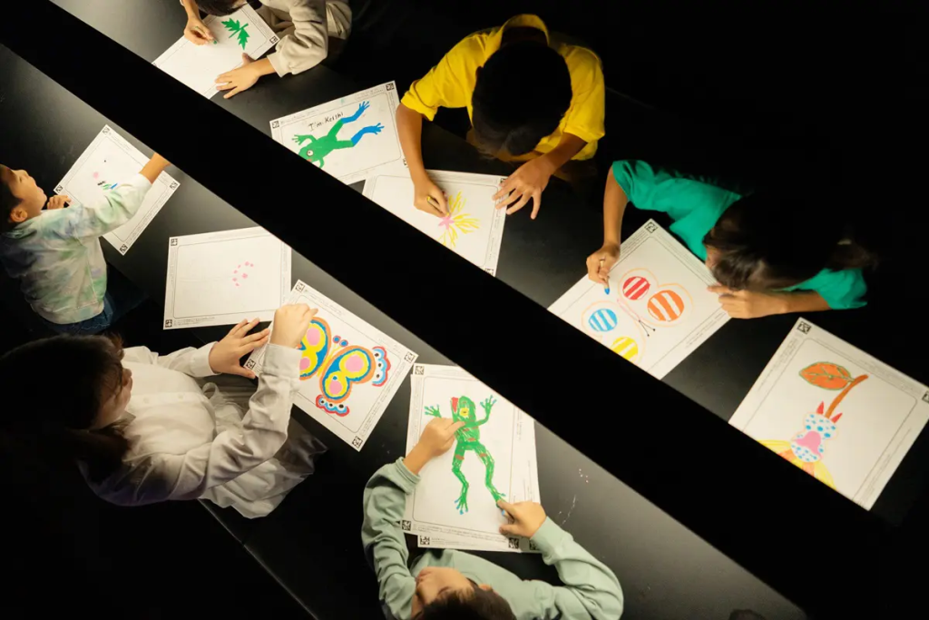 レッドリスト(絶滅危惧種)に登録されている、生き物や花のお絵かき用紙にクレヨンで自由にお絵かきをします。自分で描いた生き物に命が吹き込まれ、目の前で動き出すシーンは感動的。